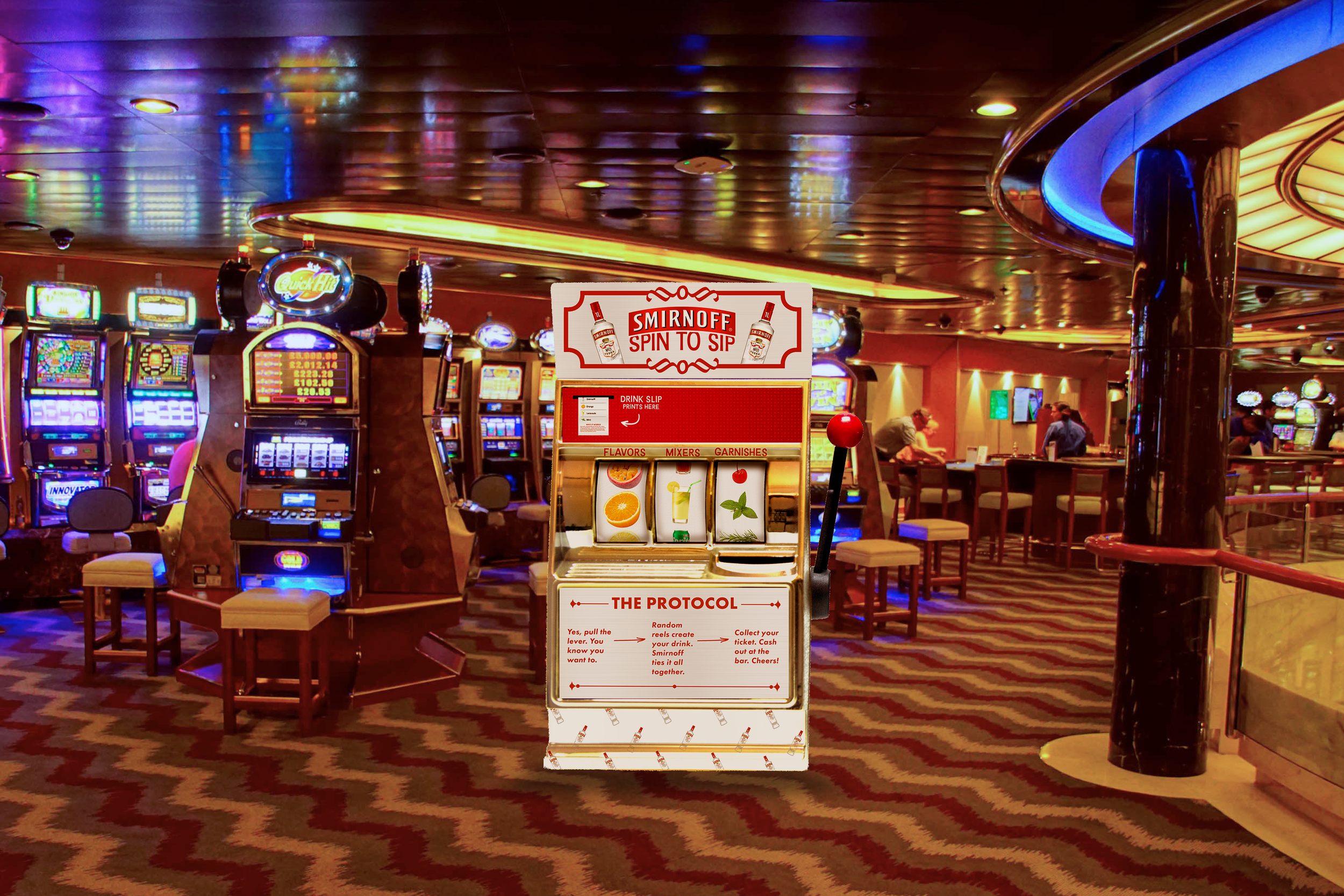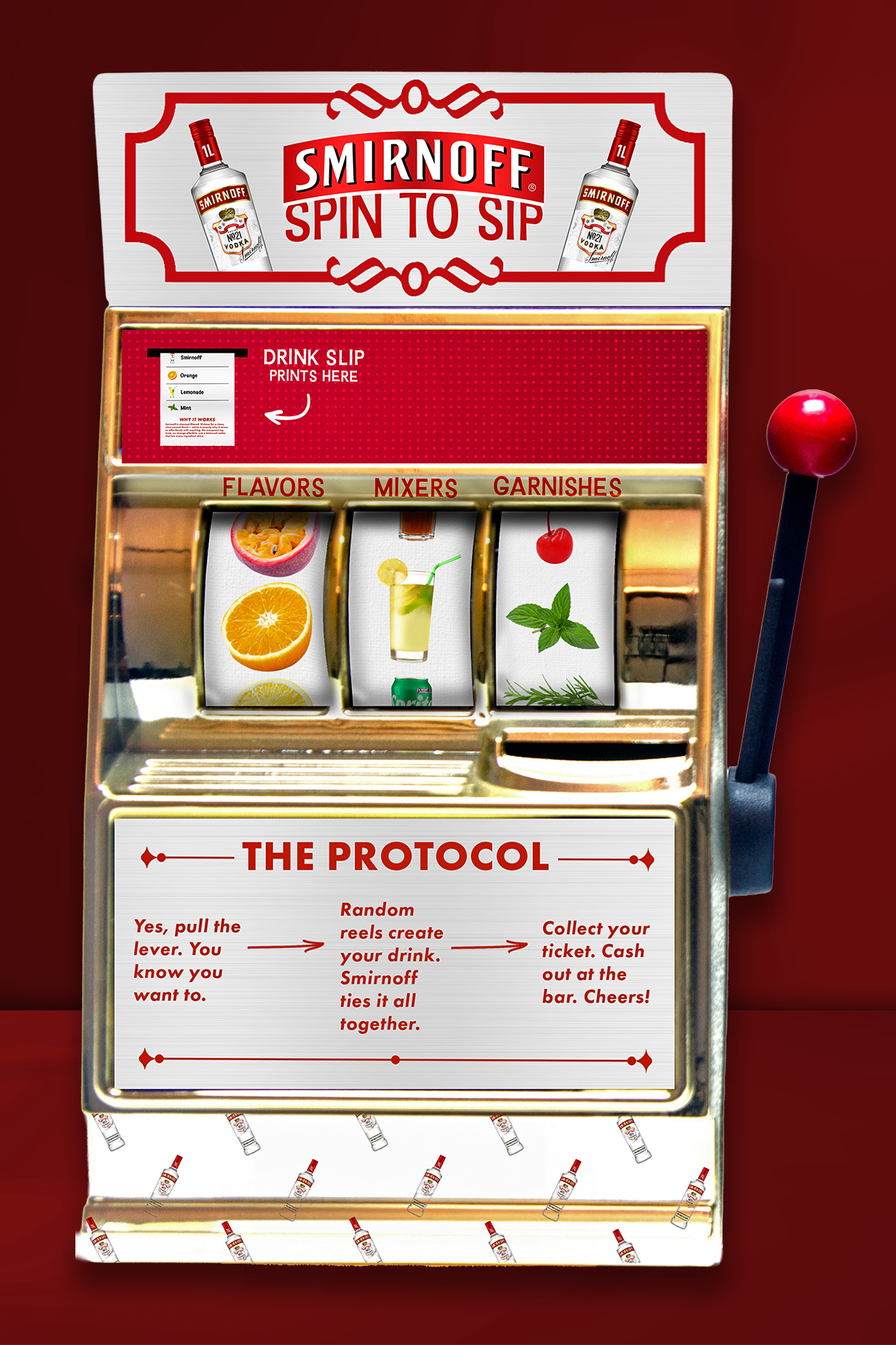 Smirnoff’s Spin To Sip is an interactive pop-up at a casino where guests spin a branded slot machine with each reel including different drink ingredients, always using Smirnoff as the base. The machine will print a drink ticket with their combination and an explanation on why Smirnoff is able to effortless pair with any combination, which guests can redeem at the bar for their drink.
